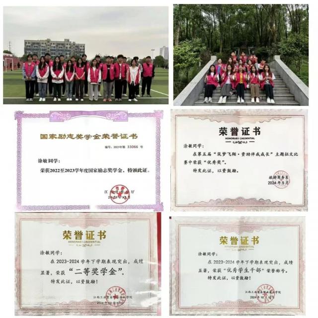 榜样人物  姓名:涂敏 涂敏,女,2022级学前教育3班,在校期间任旅游商务系自律委员会副会长、班级班长等职务,荣获国家励志奖学金2次、院级奖学金、优秀学生干部、三好学生、优秀志愿者等荣誉称号。 1.功不唐捐,玉汝于成 “立志宜思真品格,读书须尽苦功夫”。在学习上,她牢记学习是学生的第一要务,严格要求自己按时完成学习任务。课堂上,她全神贯注地听讲,认真做好笔记,积极回答问题,与老师和同学互动交流,课后,她主动复习所学知识,广泛阅读相关书籍和文献,拓宽自己的知识面,在遇到难题时她不轻易放弃,而是通过查阅资料、请教老师和同学等方式,努力寻找解决问题的方法。同时,她也乐于与同学分享学习经验和心得,与他们共同进步。