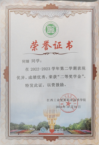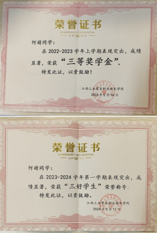 “宝剑锋从磨砺出,梅花香自苦寒来”,在学习上,我始终牢记学习是学生的第一要务,不断提升知识文化修养,学习态度端正,认真仔细,严格要求自己,刻苦钻研,制定自己的学习目标,认真学好每一门专业课程,主动和老师沟通,交流知识,经过自己的努力,学习成绩优异,专业知识在班级排名靠前,连续四个学期都荣获了学院奖学金,三好学生,技能大赛三等奖,并且利用课余时间成功考取了普通话资格证书,舞蹈资格证书。参与江西省职业技能大赛婴幼儿养育照护赛项荣获二等奖的佳绩,我明白我在不断进步,同时也在不断努力,取得更好的成绩,成为更好的自己。