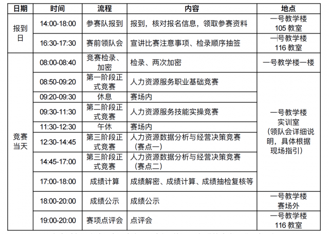 本次赛项为团队赛,赛项设置“人力资源服务职业基础竞赛”、“人力资源服务技能实操”和“大数据分析与决策应用”三个赛段,其中人力资源服务职业基础模块成绩占比20%,人力资源服务技能实操模块成绩占比40%,由人力资源企业命题、评审与评价,无缝对接人力资源服务真实工作任务场景;人力资源大数据分析及经营决策模块成绩占比40%,高水平对接人力资源服务数字化新技术,以对抗赛的形式着力考核大学生数字化素养。