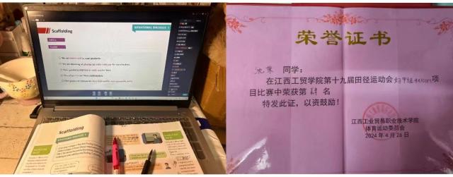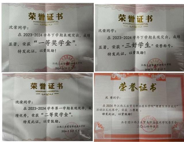沈荣,2023级商务英语1班学生,任第四届系自律委员会外联部成员,在班级上担任副班长一职。荣获2023-2024学年上学期二等奖学金,2023-2024学年下学期一等奖学金、三好学生奖,2024年“健康生活在我行”活动征文比赛三等奖,学院第十九届田径运动会女子甲组4×100m接力赛第四名。 书山有路勤为径,学海无涯苦作舟 “知不足而奋进,望远山而前行。”她深知作为学生要以学习为本,无论是想实现自身价值,还是想在社会中能够具有竞争力,都必须具有良好的专业知识作为基础。因此步入大学后,面对全新的学习氛围和生活环境,她及时地调整好心态,在每个学期给自己制定阶段性的计划与目标。在课上努力学好理论知识,夯实专业能力;在课下巩固所学知识拓宽知识面,不虚度在校时光。凭借不断的努力与执着的追求,她的成绩名列前茅,荣获两次奖学金,一次三好学生荣誉称号;考取了CET-4和普通话证书。