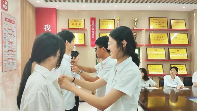 议程第五项,旅游商务系老团员为新团员们佩戴团徽。团徽在灯光下闪耀着光芒,象征着共青团的光荣与梦想。新团员们佩戴上团徽后,脸上洋溢着自豪与喜悦,他们深知这枚团徽不仅是一种荣誉,更是一份沉甸甸的责任。从这一刻起,他们将以团员的标准严格要求自己,努力成为新时代的优秀青年。