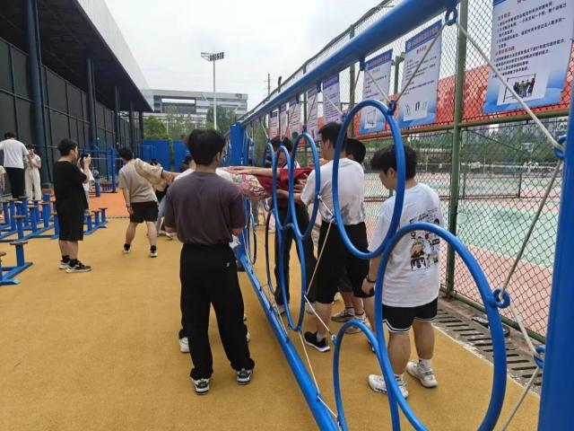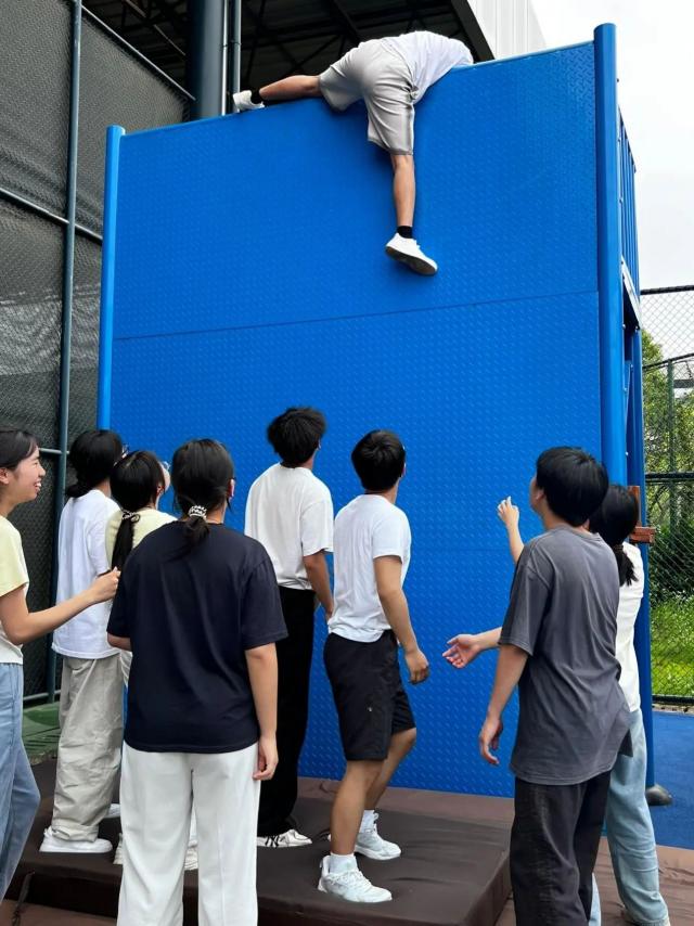随后,拓展活动进入主题阶段。各系队伍抽签以两组进行PK,比赛项目包含“梅花桩,障碍盲行,穿越电网,毕业墙”4个项目,前三项为初赛项,最后一项为决赛项目。胜者一方组成决赛3强,最后通过“毕业墙”项目确认用时由少到多,依次排名。其中,我系旅游商务系派出的锦鲤小分队表现尤为突出。队员们齐心协力、各展所长,凭借默契的配合和出色的发挥,在众多队伍中脱颖而出,荣获二等奖。