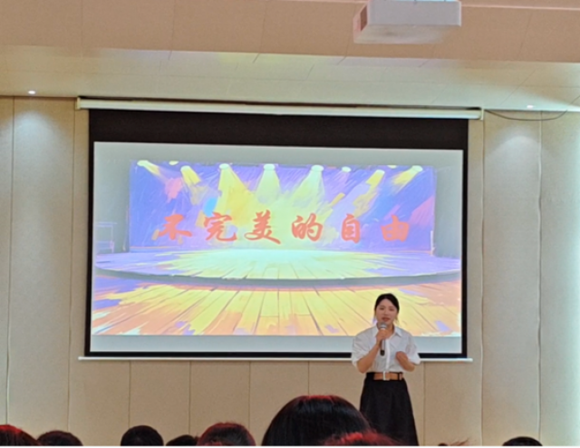 黄瑾同学在演讲开篇,以自身经历引发共鸣,讲述自己作为极端完美主义者,在筹备演讲比赛时深陷完美主义泥潭的经历。过去,她在完成作业、准备演讲等事务中,总是因过度追求完美而反复纠结。备赛期间,朋友的一番话让她恍然惊觉,自己对完美的执着实则源于内心的恐惧。而在组织活动时,频发的意外状况不仅没有让活动陷入混乱,反而让现场氛围更加轻松自在。 由此,她深刻领悟到,在真实的人生中,过程远比结果更加珍贵。最后,她分享了三个实用方法:将“必须”替换为“可以”、设置“够好”闹钟、学会发现不完美事物的独特之美,并呼吁大家接纳不完美的自己,认识到完整远比完美更有意义。