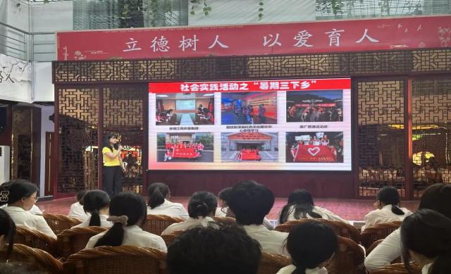 “实践育人课” 本次团课三位学生会执行主席带着一线实践故事走进课堂,通过理论学习、实践分享,共话青年在现代化征程中的使命与担当,打造了一堂别开生面的“实践育人课”。 首先,章飘同学给学员们分享了“暑假三下乡”的社会实践活动。在活动中,他们去到了彭泽,向当地群众推广普通话;走进烈士陵园,到南阳实体公园做志愿者维护秩序;通过课堂形式向孩子们传播优秀传统文化,为留守儿童开设安全知识课堂。此外,还有“启源儿童康复中心”“爱心公益课堂”“南昌西站”等一系列社会实践活动。她鼓励在场同学:“社会实践不是‘走过场’,而是要把脚印留在基层,把温暖种进人心。”