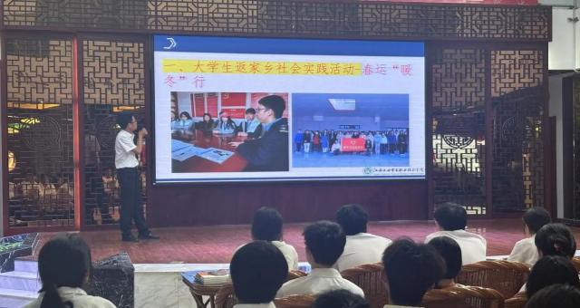 最后,由程子贤同学上台讲述“青春中国式现代化挺膺担当”分享大学生返乡社会实践经历。他讲述春运“暖冬”志愿服务、开展公益讲座和担任赛事志愿者等实践故事,点明社会实践既是锤炼个人能力的熔炉,也是积累人生阅历的宝贵契机,号召青年可以积极参与此类活动,用所学所长为家乡注入青春动能,以实际行动助力中国式现代化建设。