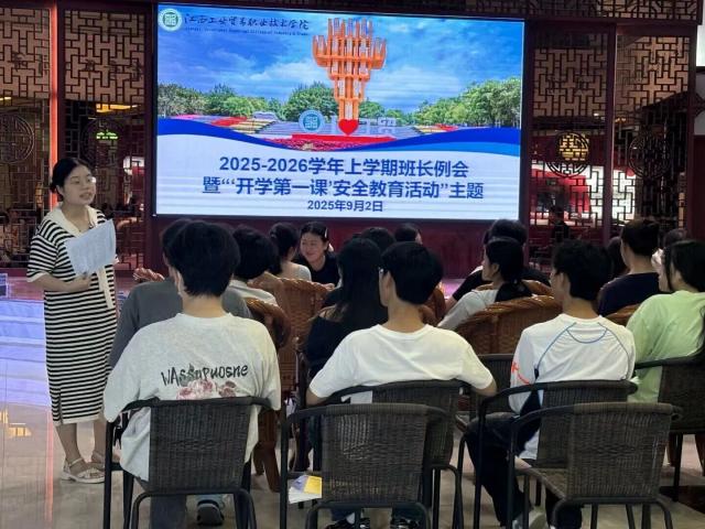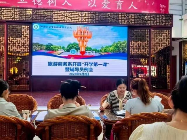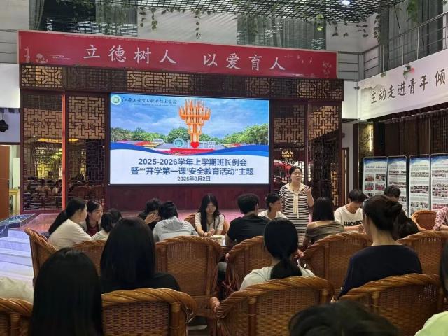 筑牢安全防线,部署新学期工作—旅游商务系召开“开学第一课” 为统筹推进新学期的学生管理,明确育人方向与分工,旅游商务系于9月2日举行了“开学第一课”安全教育会议。此次活动包括辅导员例会、班长周例会以及主题班会。由学管员肖琴琴组织会议,全体辅导员参加。会议中,学管员肖琴琴向辅导员和班长传达了学校的相关要求,为新学期的学生管理工作打下坚实基础。