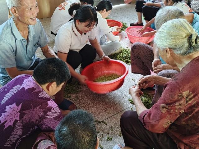 汗水浸湿衣衫,行动传递关怀。实践队员怀揣着对老人们的敬爱,在梁院长的带领下,踏入这片充满温情的土地。一同协助负责人准备晚餐,餐前有的负责剥毛豆,手指灵活地穿梭在豆荚之间,饱满的豆子就堆成了小山;有的认真洗菜,在水池边反复冲洗,不放过任何一片菜叶上的污渍,以严谨的态度确保食材的洁净;还有的帮忙摆放餐具、整理餐桌,为晚餐做好最后的准备。厨房里一片忙碌而温馨的景象,队员们的欢声笑语与锅碗瓢盆的碰撞声交织在一起,奏响了一曲爱的乐章。这不仅仅是一顿晚餐的准备,更是一次心灵的交融,是队员们与老人们共赴的一场温暖之约。 午后的阳光透过树叶洒下斑驳的光影,队员们与老人们围坐在活动中心共同参与剥毛豆的劳作。嫩绿的豆荚在手中轻轻一捏,饱满的豆粒便滚落盘中,老人们手法娴熟,不时传授着 “快速剥豆” 的小技巧,队员们学得认真,偶尔因用力不当让豆粒蹦到地上。95岁的奶奶一边剥豆一边念叨:“你们这些娃娃就像我孙辈一样,看着就亲。”队员们则趁机询问老人年轻时的生活趣事,豆荚的清香与欢声笑语交织,让简单的劳作变成了一场温馨的家常聚会,剥出的不仅是鲜嫩的豆子,更是跨越代际的亲近与信赖。