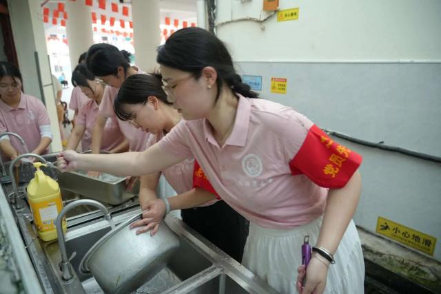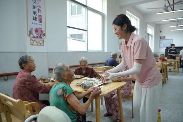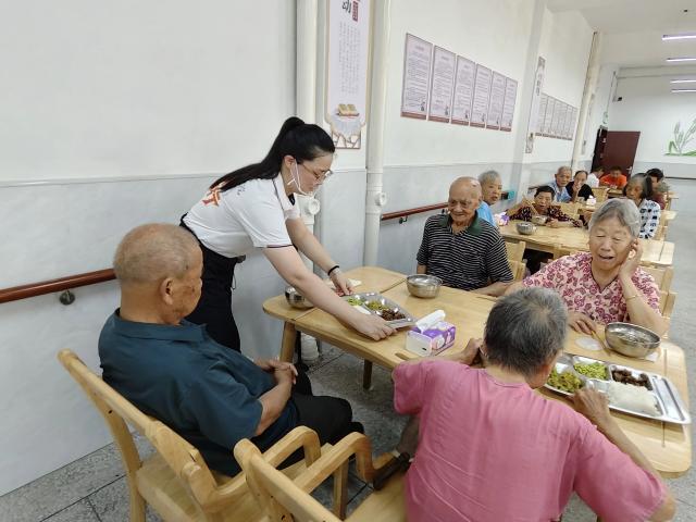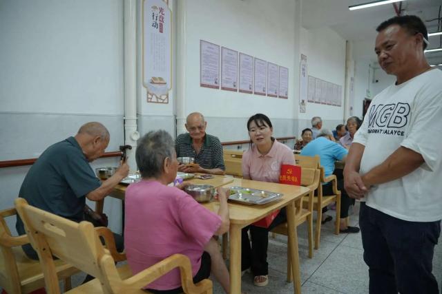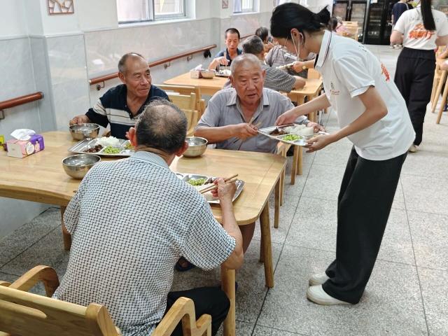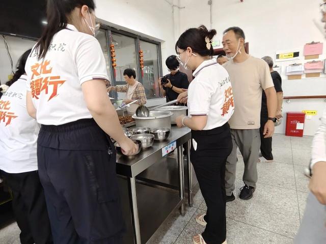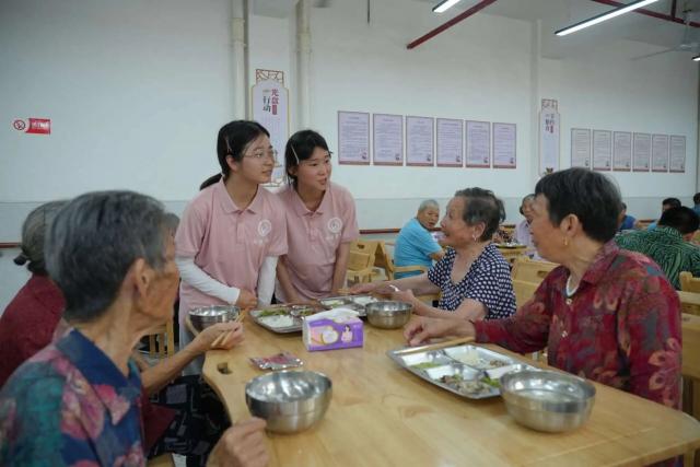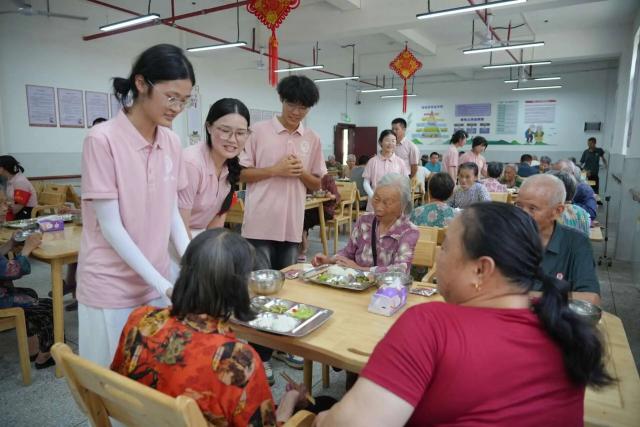 晚餐准备就绪后,队员们主动协助工作人员开展分餐工作。大家戴上口罩和手套,将热气腾腾的饭菜分装到餐盒中帮端到老人们桌前并不忘轻声叮嘱:“爷爷,今天的菜有点烫,您慢点吃。”“奶奶,这是您爱吃的毛豆。”小小的举动里藏着细致的关怀,打饭的勺子传递的不仅是饭菜的温度,更是青年一代对长辈的贴心与敬意。