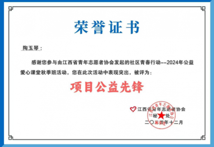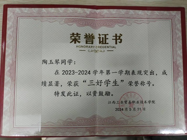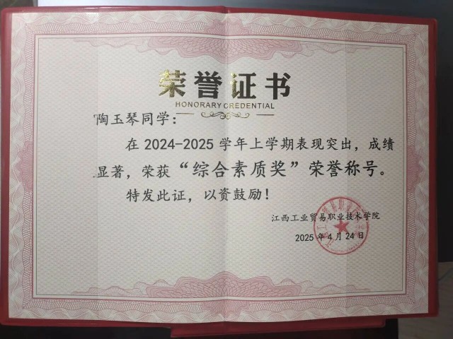 陶玉琴,女,旅游商务系城市轨道交通运营管理专业,担任班级学习委员。荣获2024-2025学年国家励志奖学金、2024-2025学年综合素质奖两次,获评"三好学生"和"项目公益先锋"称号,荣获2024年江西省大学生创新大赛银奖、2024年省职业院校技能大赛三等奖等荣誉。 坚定信念,思想进步
