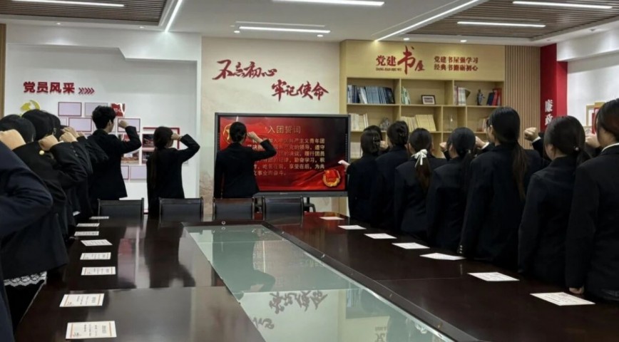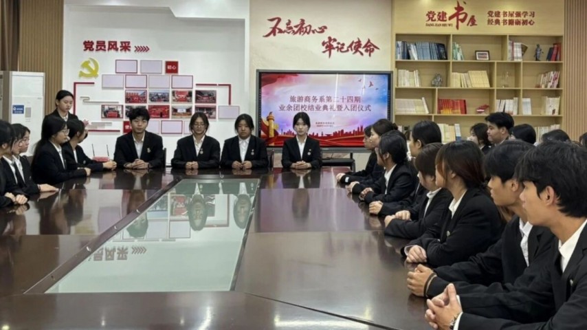 承团校之训,赴青春之约丨江西工贸职院旅游商务系第二十四期业余团校结业典礼暨入团仪式为深入学习贯彻习近平新时代中国特色社会主义思想,全面落实共青团对青年成长成才的引领培育要求,旅游商务系第二十四期业余团校结业典礼暨入团仪式于11月12日中12:30在旅游商务系宣讲室隆重举行。出席本次仪式的有旅游商务系团总支副书记刘汇慧、学生会执行主席谢锶泳、邹娇、曾佳伟,以及仪式主持人陈洁仪式在庄严国歌声中启幕,全体人员昂首挺立、目光如炬,以激昂歌声抒怀爱国深情。随后,由组织部部长陈洁郑重宣读2025年下半年新发展团员名单。30名同学经层层筛选脱颖而出,成为共青团新鲜血液,将以团员标准践行使命,在学习实践中传递奋进力量。