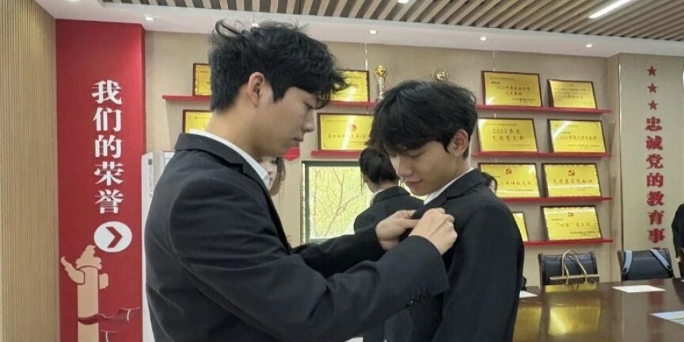 议程第五项,由旅游商务系老团员手持新团徽上前为新团员佩戴。新团员们纷纷挺直腰背,静静感受金属团徽的微凉触感与背后承载的责任重量。最后一枚团徽佩戴完毕,大家下意识整理衣襟,让团徽在灯光下熠熠生辉。
