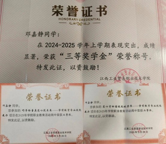 筑牢思想之基,勤学以增智,笃行以致远,奋力擘画高质量发展新篇章|榜样人物第四十二期——邓嘉静 邓嘉静,女,共青团员,2023 级学前教育专业学生。荣获2024-2025国家励志奖学金、2024-2025上学年学院三等奖学金、2024年-2025 年下学年学院二等奖学金等荣誉。 在思想层面,我积极追求进步,向先进组织靠拢,并光荣地成为了一名共青团员。我深知,崇高的理想信念是青年学子立身之本。为此,我自觉学习党的理论方针,关注时事政治,不断提升自己的政治素养和思想觉悟。我时刻以团员的标准严格要求自己,在心中筑牢信仰之基,努力将社会主义核心价值观内化于心、外化于行,希望将个人的成长与国家的发展紧密相连,让青春的航向始终明确而坚定。