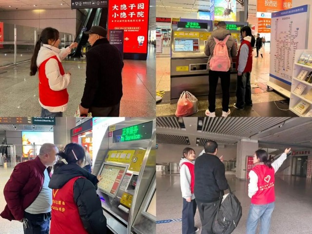 志愿活动期间,在进站口和地铁站售票处,志愿者为旅客提供引导服务,帮助他们快速找到正确的进站通道和售票窗口,对于不熟悉智能设备操作的老年旅客,志愿者们耐心细致地教他们刷证进站、购票等操作流程,确保每位旅客都能顺利进站;在候车大厅和安检口,志愿者们协助车站工作人员维持秩序,引导旅客有序排队,避免拥挤和混乱。高峰时段,志愿者们时刻关注人流情况,及时疏导,确保旅客能够快速通过安检、顺利出行;在出站口和网约车上车点,志愿者们主动帮助旅客搬运行李,尤其是对于携带大件行李或行动不便的旅客,提供贴心帮助,让他们切实感受到温暖。