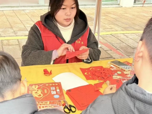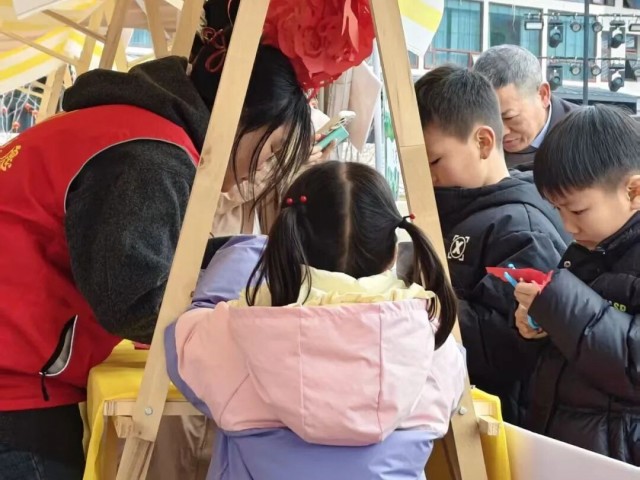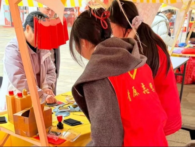 她说:摊位前总围着一群小朋友,他们攥着剪刀的小手颤巍巍的,拓印时也总把颜料弄得到处都是。我一遍遍教他们折纸、下剪,手把手带着按压拓包,看着他们举着歪歪扭扭的福字欢呼,突然想起老师说过“非遗的生命力,在于烟火气里的传承”。有个小朋友拉着我说“原来福字还能这么剪”,这句话让我明白,我们做的不仅是志愿服务,更是在给孩子们心里种下传统文化的种子。和返乡的大学生伙伴们搭班的日子也很温暖。有人忙不过来,隔壁摊位的同学就主动过来搭手;换班吃饭时,大家都会提前到岗,不让游客久等。这种默契,让繁琐的引导、整理工作变得格外有干劲。